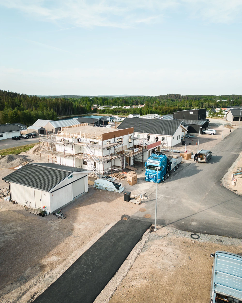 - Vi kände att vi ville bygga i Himlabackarna i Vetlanda och vi ville ha en tomt som inte var så jättesto, men vi var ganska sent ute så det fanns inte jättemånga tomter att välja på. Men i slutändan är nu väldigt nöjda med tomten som det blev, det är ju en fantastisk utsikt här med balkongen på baksidan så kommer det nog bli riktigt bra, säger Tobias.